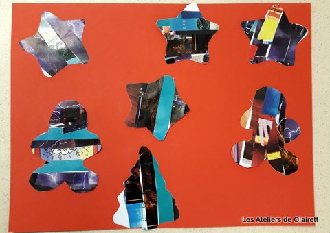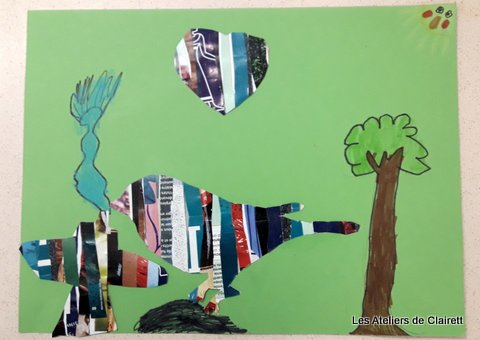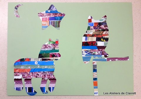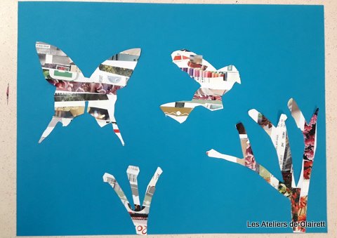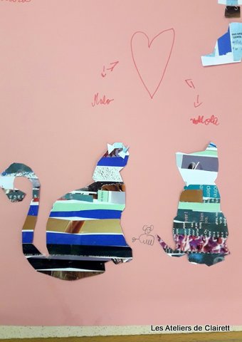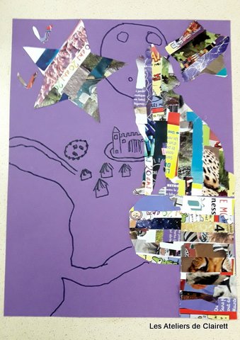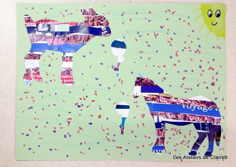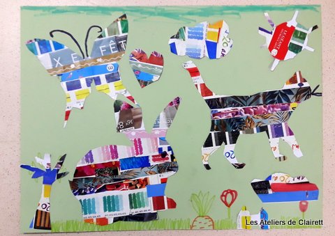 Les bandes sont réalisées à partir de diverses revues, puis coller et assembler avant d’être découper en forme d’animaux.